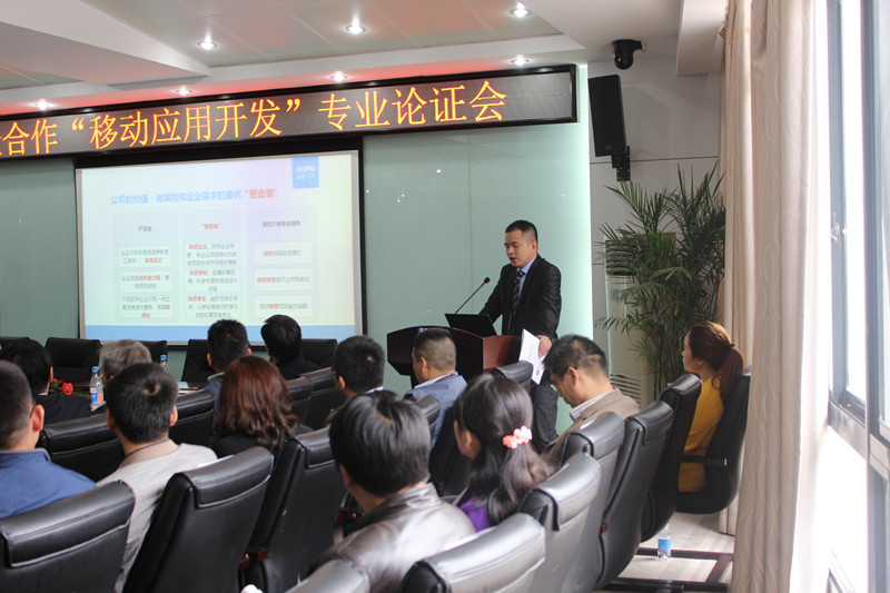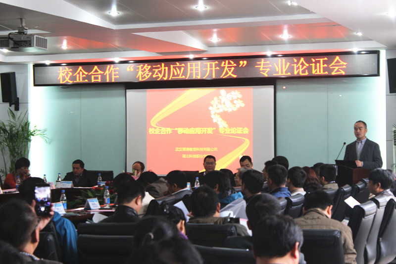 為滿足行業(yè)、企業(yè)對移動應用開發(fā)技術人才的需求,進一步推動產(chǎn)教融合、校企合作,提高人才培養(yǎng)質量,搭建行業(yè)、企業(yè)、高校的溝通平臺,武漢厚溥教育科技有限公司與湖北科技職業(yè)學院于2015年11月07日在光谷軟件園共同舉辦校企合作“移動應用開發(fā)”專業(yè)論證會。