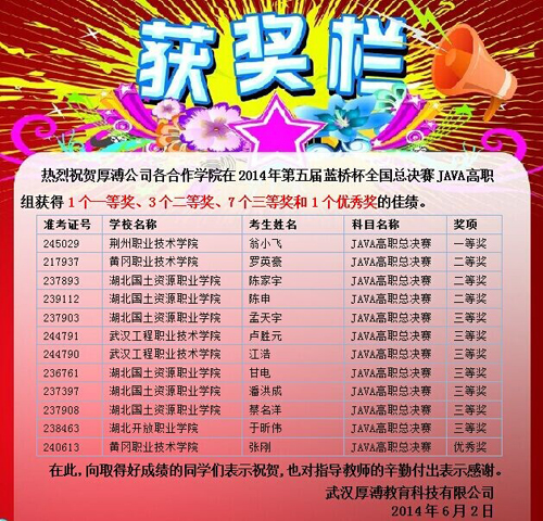 目前,2014年第五屆藍橋杯全國軟件和信息技術專業人才大賽成功落幕,現個人賽獲獎名單已經在大賽官網公布。武漢厚溥教育科技有限公司合作院校有12名大學生在本屆藍橋杯總決賽中榮獲佳績!
