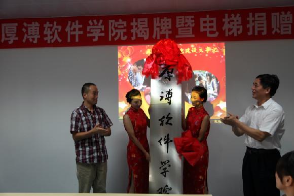 在熱烈的掌聲和歡快的音樂聲中,校黨委書記韓德鋒、武漢厚溥教育科技有限公司董事長陳相陽共同為厚溥軟件學院揭牌。隨后舉行了電梯捐贈儀式